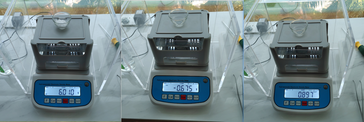 - 為使數(shù)據(jù)更加精確,進行二次實驗;(若樣品需要重復使用,一定要使用酒精浸泡清洗,這樣能去除塑料顆粒在水中產(chǎn)生的氣泡,然后擦干)重復上面的測量步驟,(樣品2)放在架子上面顯示空氣中的重量010g,然后按mode鍵記錄下重量,再將塑料顆粒放入水中顯示水中重量0.675g,按下mode鍵記錄下重量。顯示密度值0.897g/cm3。