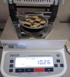 再次測試同樣撕取2克紙皮均勻平鋪在托盤中,5分鐘左右檢測結(jié)束結(jié)果顯示10.74%。