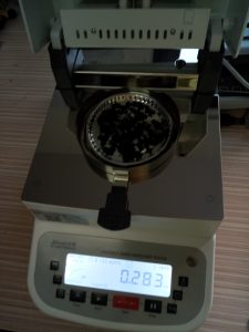 為了得到更精確穩(wěn)定的數(shù)據(jù)結果,在進行第二次測試過程前先等待電池粉末水分儀降溫,待水分儀本身冷卻至40度以下時,這次我們?nèi)?克多電池粉末就好,將電池粉末平鋪均勻,這次我們把溫度降至135℃,按“START”鍵開始測試,1分33秒后檢測結束,檢測數(shù)據(jù)顯示283%;