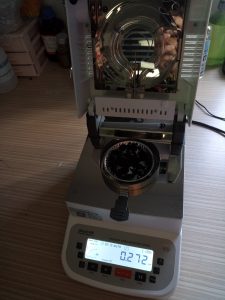 為了使測試過程中電池粉末水分儀將電池粉末烘干烘透,我們將電池粉末分散開來,以便溫度能滲透進電池粉末內(nèi)部。取7克多電池粉末撒于不銹鋼托盤中,用鑷子將電池粉末平鋪均勻,為避免電池粉末經(jīng)過高溫度加熱后變性,我們將溫度設置在140℃,按“START”鍵開始測試,2分10秒后檢測結束,檢測數(shù)據(jù)顯示272%;