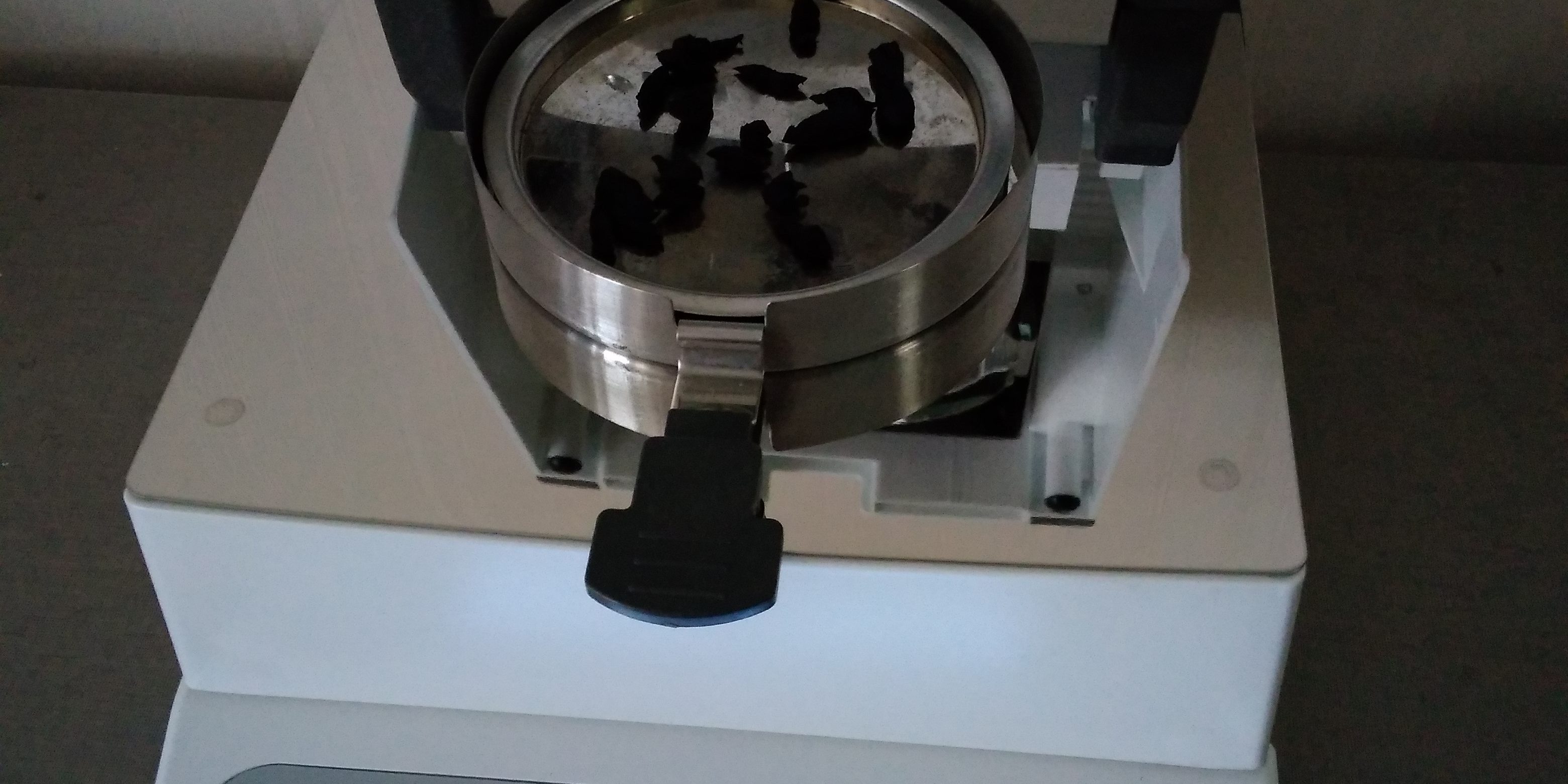 測試話梅干碎:為了使測試過程中話梅干水分儀將話梅干烘干烘透,我們將話梅干用剪刀剪成碎片,攤成分散狀,以便溫度能滲透進去。取3克左右話梅干碎均勻鋪撒在不銹鋼托盤中,用鑷子將話梅干碎平鋪均勻,為使話梅干水分完全烘干并且不變焦,我們將溫度設(shè)置在160℃,按“START”鍵開始測試,25分04秒后檢測結(jié)束,檢測數(shù)據(jù)顯示58.44%;