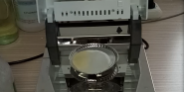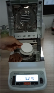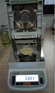 二、儀器本身有個(gè)自動(dòng)降溫過(guò)程,為求得數(shù)據(jù)的準(zhǔn)確性,故在進(jìn)行第二次測(cè)量的時(shí)候先等待幾分鐘,使儀器顯示溫度為40度以下時(shí)再進(jìn)行第二次測(cè)量,這次我們加大膠水樣品量為7.025克,將膠水均勻滴于鋁箔盤(pán)上,溫度照樣設(shè)定在120℃,按“START”鍵開(kāi)始進(jìn)行測(cè)試,由于這次的膠水量比較多,所以?xún)x器此次用了17分鐘43秒才測(cè)試結(jié)束,測(cè)試結(jié)果數(shù)據(jù)顯示31.17%(含水率),按“單位鍵”切換其顯示數(shù)據(jù),則屏幕顯示其固含量為68.83%。