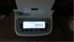 測試樣品2:為了檢測儀器的精確性,待儀器溫度降至30℃(常溫)以下時進行第二次測量,用藥匙取樣10-12g,用藥匙取樣10-12g纖維紙上,溫度設(shè)置85℃用儀器進行加熱,約3分鐘后檢測結(jié)束,檢測數(shù)據(jù)顯示0.066%;