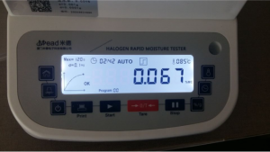 測試樣品3:為了檢測儀器的精確性,待儀器溫度降至30℃(常溫)以下時進行第二次測量,用藥匙取樣10-12g,用藥匙取樣10-12g纖維紙上,溫度設(shè)置85℃用儀器進行加熱,約3分鐘后檢測結(jié)束,檢測數(shù)據(jù)顯示0.067%;