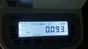 測試樣品2:為了檢測儀器的精確性,待儀器溫度降至30℃(常溫)以下時進行第二次測量,用藥匙取樣10-12g,用藥匙取樣10-12g纖維紙上,溫度設(shè)置85℃用儀器進行加熱,約3分鐘后檢測結(jié)束,檢測數(shù)據(jù)顯示0.093%;