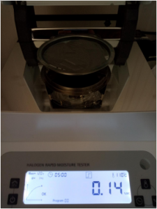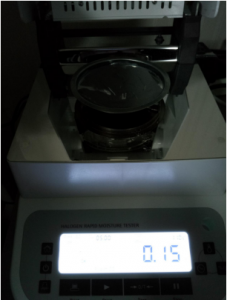第一次,因樣品3屬金屬粉末,密度較大,取10克樣品3#粉末,置于不銹鋼托盤中,用鑷子將金屬粉末平鋪均勻,溫度設(shè)置110℃用儀器進(jìn)行加熱,定時(shí)5分鐘后檢測結(jié)束,檢測數(shù)據(jù)顯示0.15%;